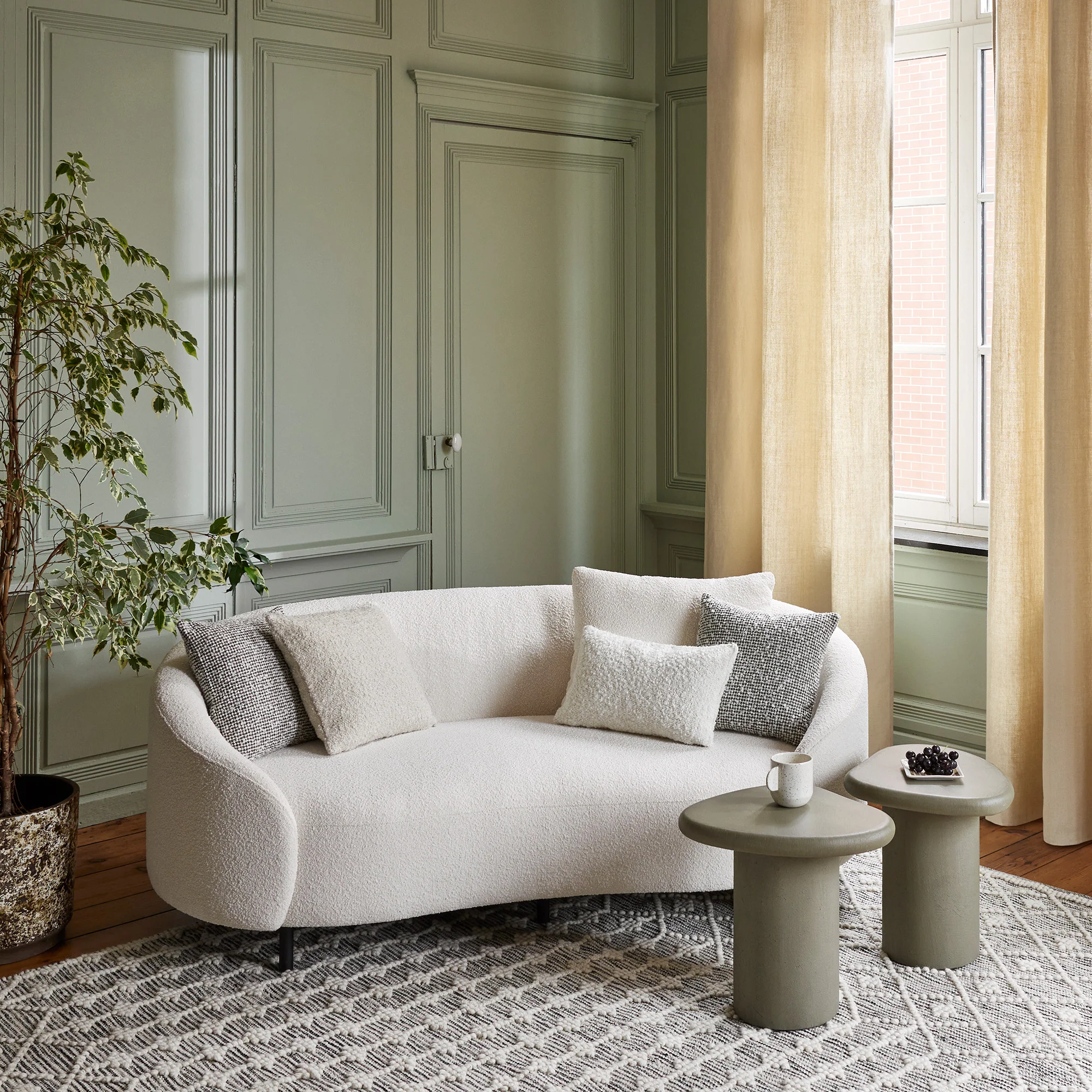Courbes enveloppantes et réconfortantes, bouclette à la douceur indéniable, le canapé 2 places Julika s'impose comme l'un des véritables coups de cœur de notre collection.