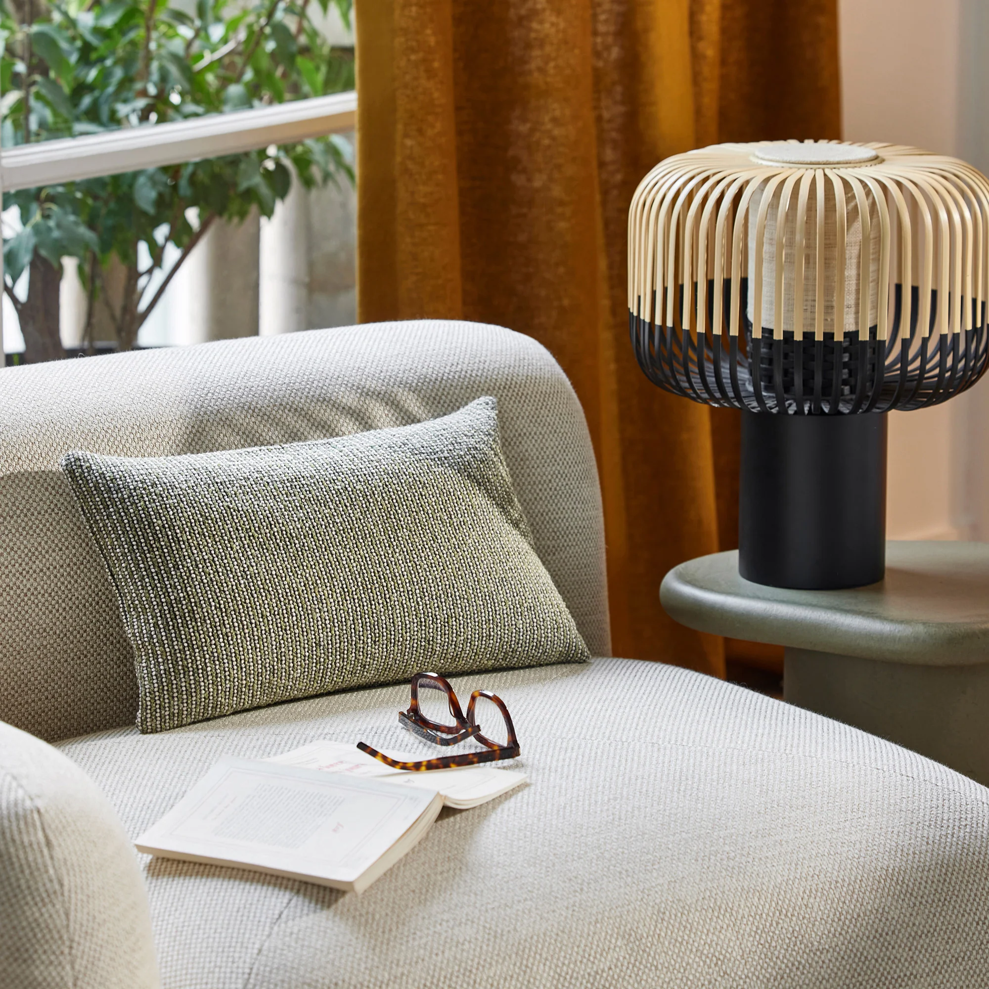 Le coussin Teora, rencontre entre la chaleur d'une texture laineuse dense et la finesse d’une rayure tissé en jacquard.