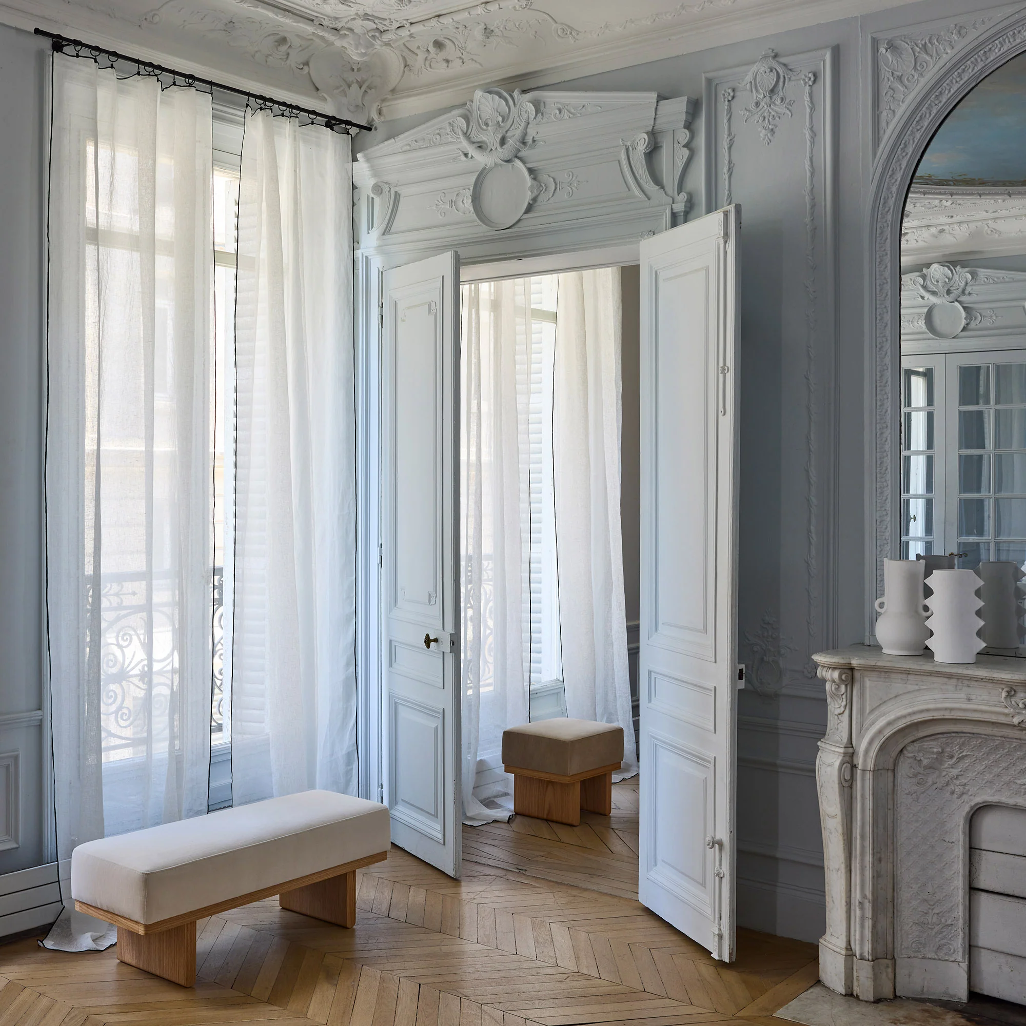 Léger et aérien, c'est en toute discrétion que le panneau Shadow en lin blanc pur au fini d’un point bourdon contrasté noir, se fond sur vos fenêtres.